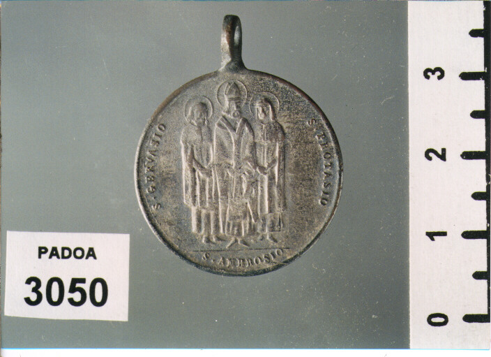 D/ S. GERVASIO S. PROTASIO, LE FIGURE STANTI DEI TRE SANTI; IN ESERGO, S.AMBROSIO; R/ TRASLAZIONE SOLENNE DELLE RELIQUIE AMBROS.NE MAGGIO 1874/ SCOPERTI IL 8 AGOSTO 1871, SEPOLCRO; SOTTO, MILANO