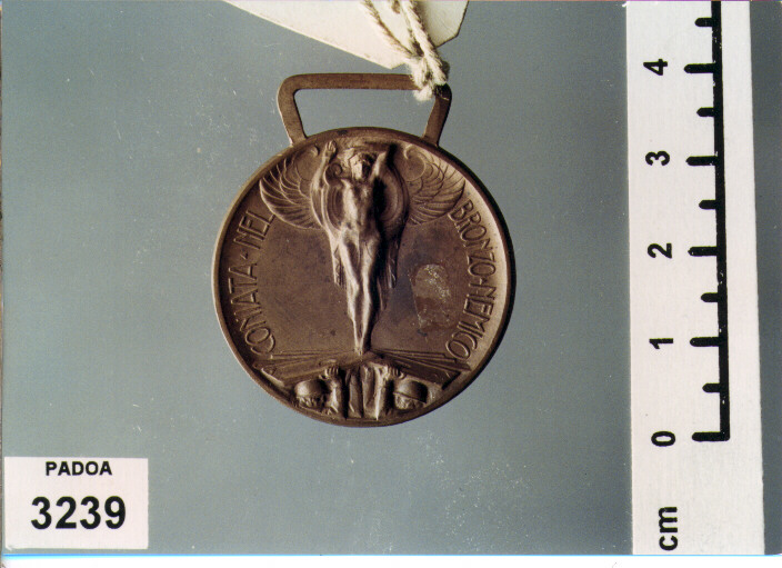 D/ GVERRA PER L'VNITA' D'ITALIA 1915- 1918, TESTA ELMATA A S.; DIETRO, S.CANEVARI; SOTTO, SACCHINI MILANO; R/ CONIATA. NEL BRONZO. NEMICO, FIGURA FEMMINILE ALLEGORICA SORRETTA DA SOLDATI