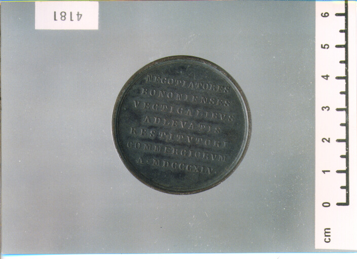 D/ IACOBO. ANTONELLIO. PRAEF. AERAR. PONT. MAX, STEMMA GENTILIZIO; R/ NEGOTIATORES/ BONONIENSES/ VECTIGALIBVS/ ADLEVATIS/ RESTITVTORI/ COMMERCIORVM/ A. MDCCCXLV