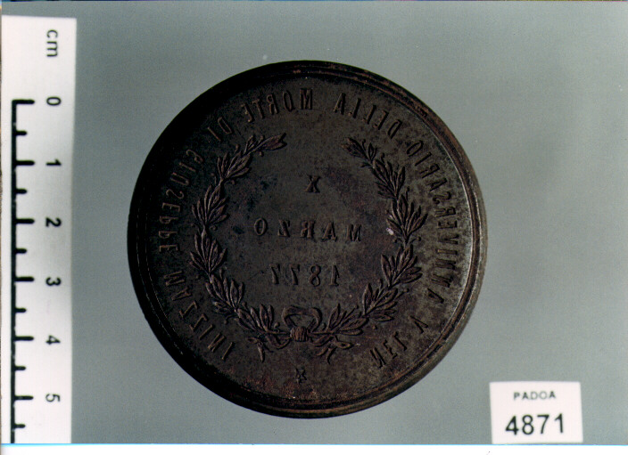NEL V ANNIVERSARIO DELLA MORTE DI GIUSEPPE MAZZINI; NEL CAMPO, X/ MARZO/ 1877, ENTRO CORONA DI ALLORO