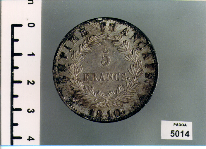 D/ NAPOLEON EMPEREUR., TESTA LAUREATA A D.; SOTTO, T.R; R/ EMPIRE FRANCAIS. 1810.; NEL CAMPO, 5/ FRANCS., ENTRO CORONA DI ALLORO. TAGLIO: DIEU PROTEGE LA FRANCE
