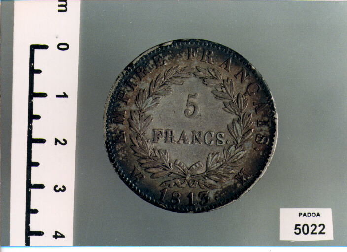 D/ NAPOLEON EMPEREUR., TESTA LAUREATA A D.; NEL TAGLIO, BRENET; SOTTO, T.R; R/ EMPIRE FRANCAIS. VR 1813. MA; NEL CAMPO, 5/ FRANCS, ENTRO CORONA DI ALLORO. TAGLIO: DIEU PROTEGE LA FRANCE