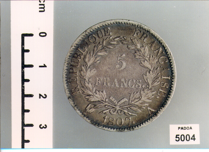D/ NAPOLEON EMPEREUR., TESTA A D.; NEL TAGLIO, BRENET; SOTTO, T.R; R/ REPUBLIQUE FRANCAISE. 1807. A; NEL CAMPO, 5/ FRANCS., ENTRO CORONA DI ALLORO.TAGLIO: DIEU PROTEGE LA FRANCE