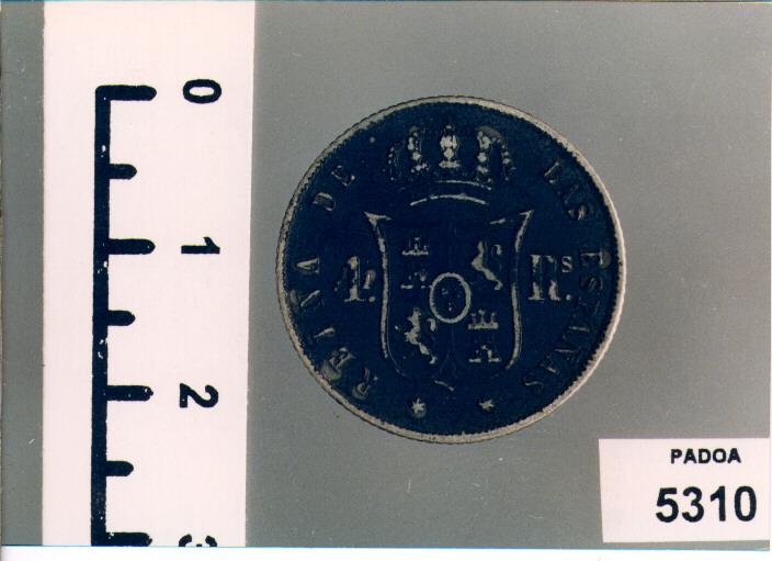D/ ISABEL 2.A POR LA GRACIA DE DIOS Y LA CONST, TESTA A D.; SOTTO, .1854.; R/ REINA DE LAS ESPANAS, STEMMA CORONATO; AI LATI A S., 4; A D., R.S. TAGLIO: RIGATO