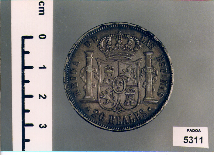 D/ ISABEL 2.A POR LA G. DE. DIOS. Y LA CONST., TESTA LAUREATA A D.; SOTTO, . 1862; R/ REINA DE LAS ESPANAS., STEMMA CORONATO TRA DUE COLONNE; SOTTO, 20 REALES