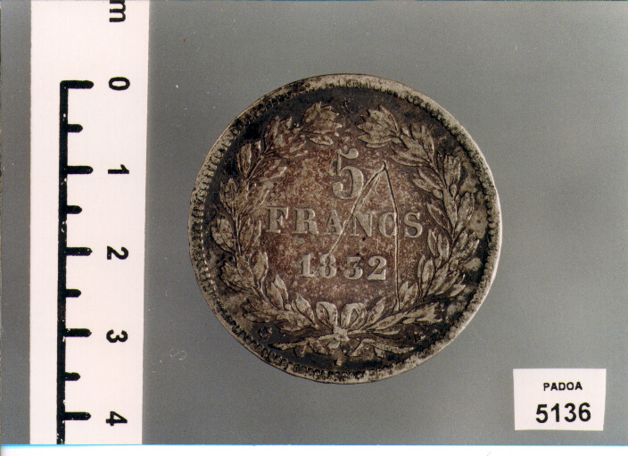 D/ LOUIS PHILIPPE I ROI DES FRANCAIS, TESTA LAUREATA A D.; SOTTO, DOMARD.F.; R/ 5/ FRANCS/ 1832, ENTRO CORONA DI ALLORO; SOTTO, A. TAGLIO: DIEU PROTEGE LA FRANCE