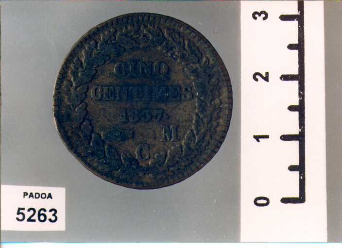 D/ HONORE V PRINCE DE MONACO., TESTA A S.; SOTTO, [....]; R/ CINQ/ CENTIMES/ 1837./ M/ C, ENTRO CORONA DI QUERCIA