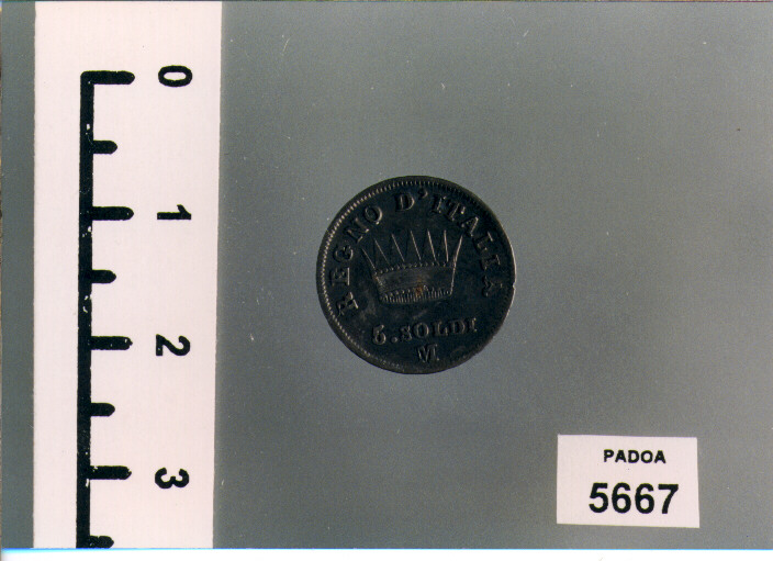 D/ NAPOLEONE IMPERATORE E RE, TESTA A D.; SOTTO 1811 TRA MELAGRANA E COPPA CAPOVOLTA; R/ REGNO D'ITALIA, CORONA; SOTTO, 5. SOLDI/ M. TAGLIO: STELLETTE INCISE