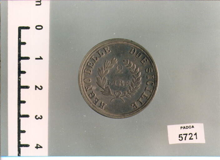 D/ GIOACCHINO NAPOLEONE, TESTA A D.; SOTTO 1813; R/ REGNO DELLE DUE SICILIE; NEL CAMPO, 2/ LIRE, ENTRO CORONA DI ALLORO E ULIVO. TAGLIO: DIO PROTEGGE IL REGNO