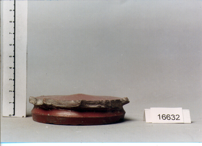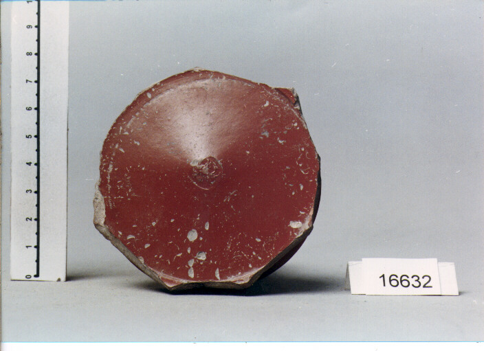 PIATTO, PIEDE AD ANELLO CON PROFILO SAGOMATO RIENTRANTE VERSO IL BASSO. ALL'INTERNO E' IMPRESSO UN BOLLO (?) CIRCOLARE CON BUE ANTROPOFAGO GRAFFITOALL'ESTERNO. VERNICE BRILLANTE