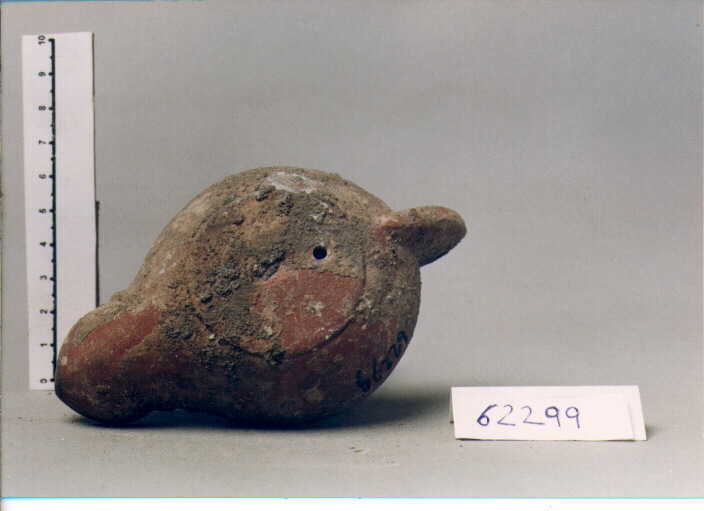 DISCO INCAVATO, DELIMITATO DA PROFONDA SOLCATURA, ENTRO CUI: UOMO NUDO, BARBATO, GRADIENTE A DESTRA. FONDO APPENA RILEVATO CON CERCHIO INCISO E PLANTA PEDIS. VERNICE ROSSA