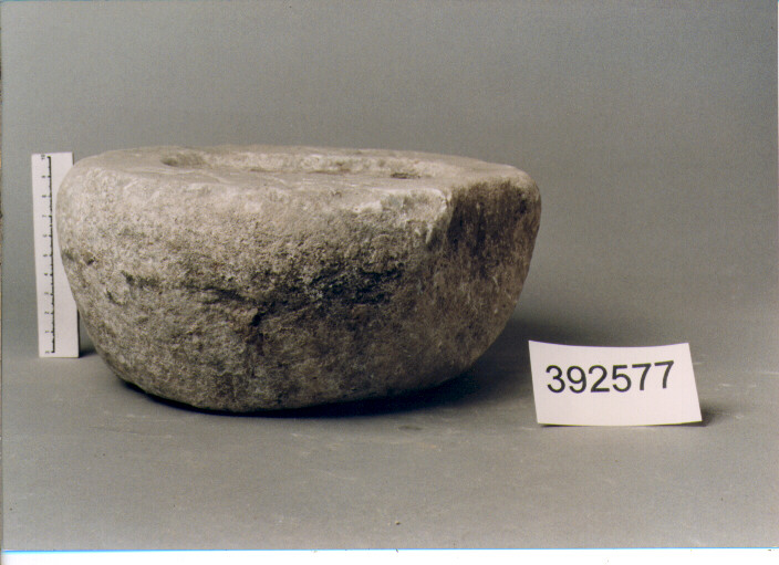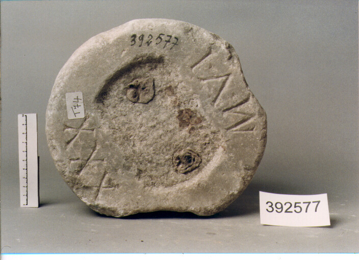 SFERICO A DUE BASI. SULLA BASE MAGGIORE INCAVO RETTANGOLARE CON RESTI DI PIOMBO E DI FERRO DELLA MANIGLIA. AL DI SOPRA E AL DI SOTTO DELL'INCAVO ISCRIZIONE INCISA CON MISURA PONDERALE. LA BASE MINORE E' LEGGERMENTE CONCAVA