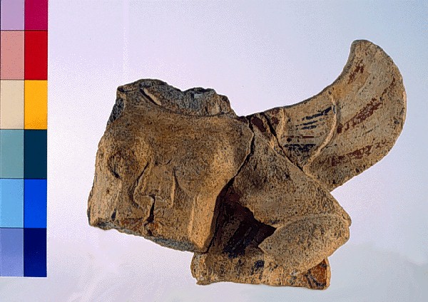 Antefissa a figura intera di arpia con ali aperte. L''esemplare è ottenuto mediante due matrici, rispettivamente, per il corpo e per le ali con la base, uniti dopo lo stampo. Appartengono a questo tipo 13 frammenti pertinenti ad almeno tre esemplari. Il tipo è quello comune con busto e testa femminile e parte inferiore di uccello che mostra le zampe retratte con gli artigli in primo piano. A Vignale sono attestate due serie, che si differenziano per la posizione delle ali e delle braccia. Nella prima serie, quella cui appartiene l''esemplare della scheda, le ali sono aperte con le braccia piegate e lontane dal corpo, forse a rappresentare l''animale in volo con atteggiamento minaccioso. Argilla rosa con nucleo grigio, con sabbia ed inclusi di piccloe dimensioni. Ingobbio della stessa argilla