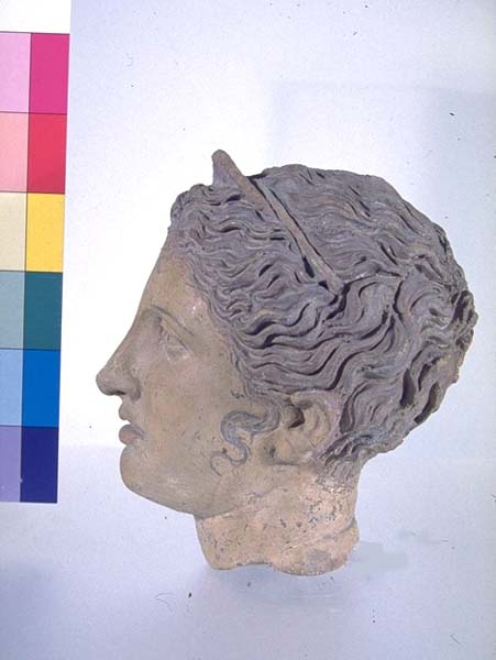 Testa femminile a tuttotondo, volta a destra. La parte destra del volto è sommariamente rifinita. I capelli sono raccolti dietro la nuca con un nodo. Ornata da un diadema tubolare che al centro si allarga a triangolo ed è decorato da perle. Caratteri iconografici non bene definiti, ne permetterebbero l''interpretazione sia come Afrodite che come Artemide. Argilla nocciola