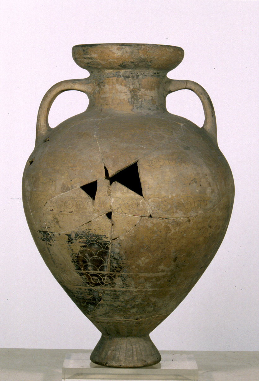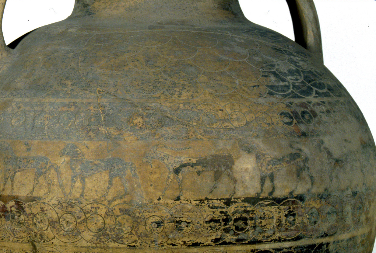 Labbro ad echino a profilo convesso, collo cilindrico, corpo ovoide, piede troncoconico, anse a bastoncello impostate sul collo e sulla spalla. Interamente verniciata tranne una zona risparmiata nella metà superiore del corpo con fregio zoomorfo continuo gradiente a sinistra tra due fasce a guilloches incisa ed interrotto dalle anse con A) cervo pascente, 2 cavalli, stambecco, 2 pantere col muso di prospetto, 2 cervi pascenti, un cinghiale pascente. B) cinghiale pascente, 2 pantere col muso di prospetto, grifone, volatile, pantera col muso di prospetto, 2 sfingi, cervo pascente. La decorazione graffita a squame interessa la spalla e la parte inferiore del corpo (due zone interrotte dal motivo a guilloches); sul fondo e presso il piede baccellature incise, al centro di ogni squama un punto sovradipinto in bianco o paonazzo