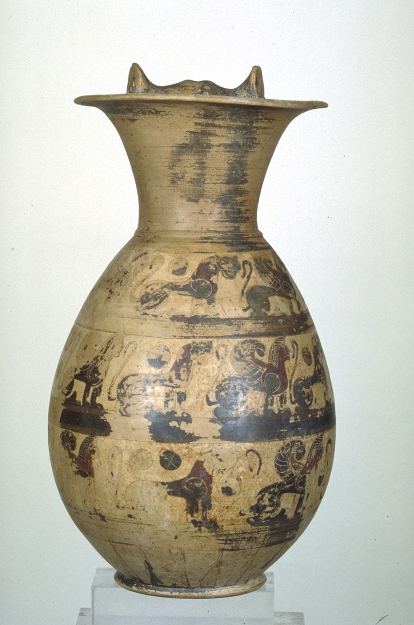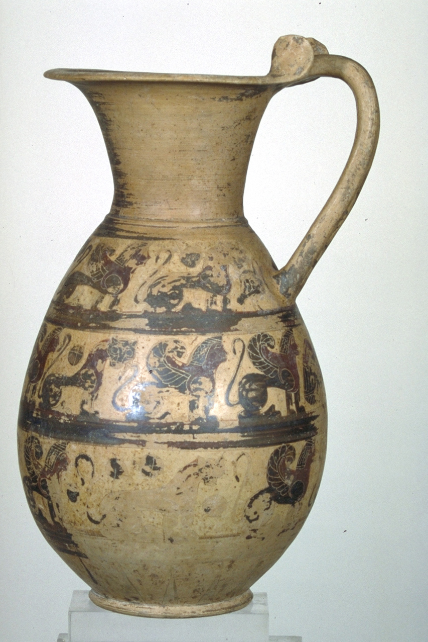 Labbro svasato, collo troncoconico con collarino, corpo ovoide, piede ad anello, ansa a doppio bastoncello impostata su orlo e spalla. Sul corpo tre fregi teriomorfi in registri delimitati da fasce con linee suddipinte in paonazzo: I) due sfingi ed un cigno alternati a tre pantere sedute col muso di prospetto; II) un cigno, una sfinge ed una pantera alternate per tre volte, due sfingi; III) quattro pantere alternate ad altrettante sfingi; nei campi riempitivi a rosetta con petali incisi. Collo, ansa e piede verniciati; raggi presso il piede; dettagli dei corpi degli animali suddipinti in paonazzo