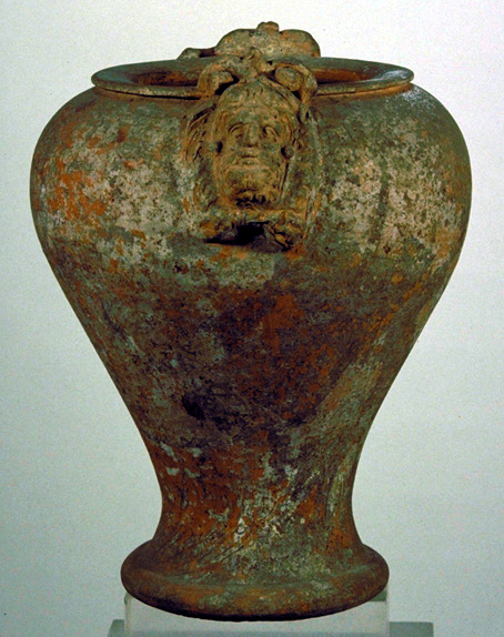 Orlo a fascia, spalla bombata, attacchi a doppio anello non passanti per l''ansa, corpo troncoconico, piede a disco, fondo assente. Agli attacchi delle anse: protome di Eracle barbato con leonté