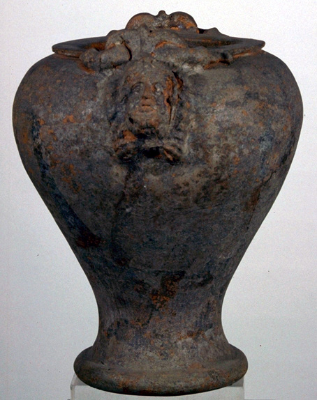Orlo a fascia, spalla bombata, attacchi a doppio anello non passanti per l''ansa, corpo troncoconico, piede a disco, fondo assente. Agli attacchi delle anse: protome di Eracle barbato con leonté