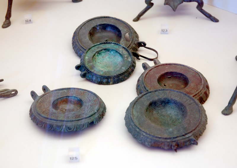Vaschetta con labbro pendente decorato con ovoli e lancette, una coppia di appendici forate per un''ansa mobile disposte verticalmente sulla superficie esterna del labbro, cavità emisferica, piede ad anello. Decorazione incisa: sulla superficie piana tralcio ad onda con infruttescenze puntinate