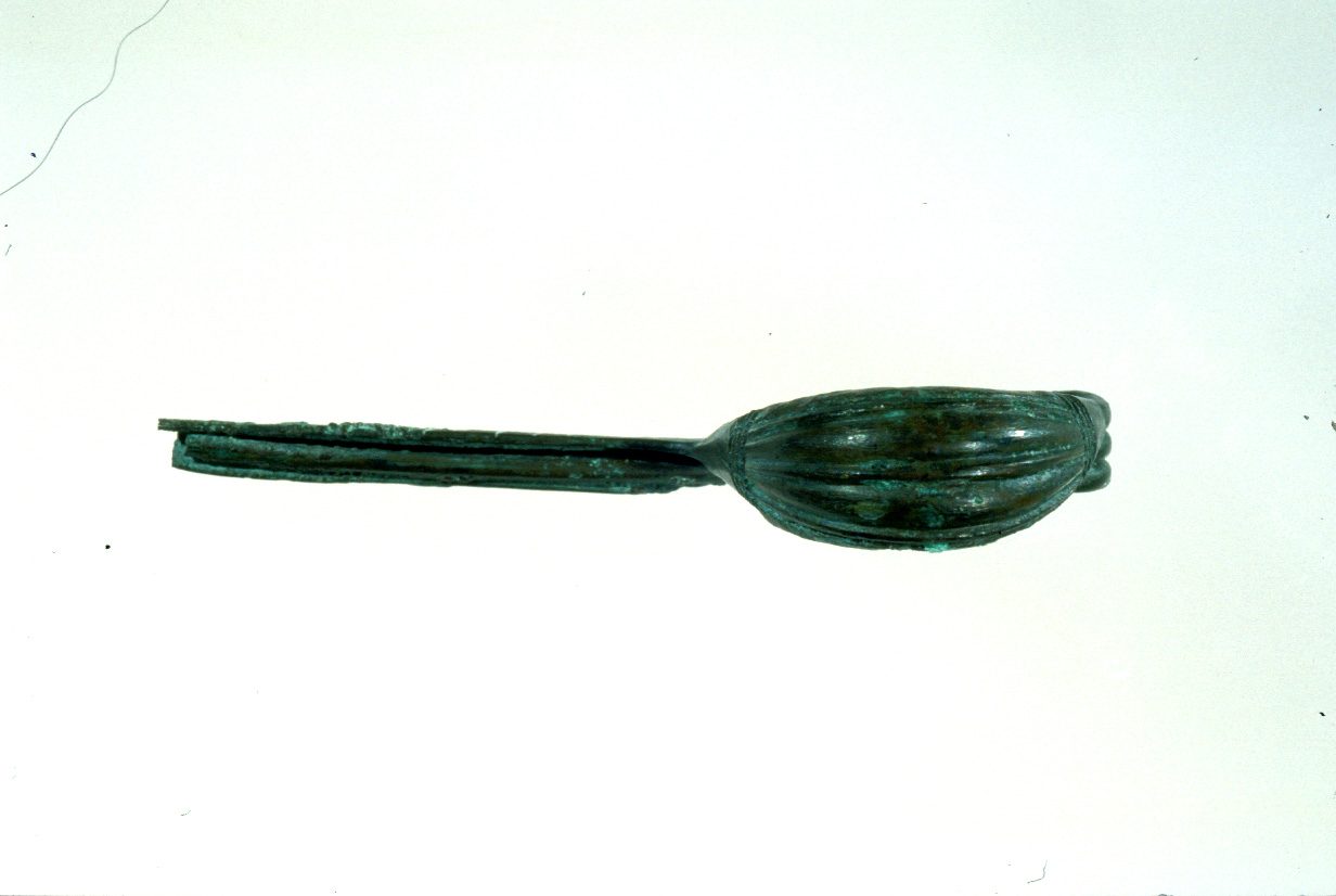 arco decorato con costolature longitudinali, alle estremità con linee incise trasversali, molla a due avvolgimenti, lunga staffa rotta