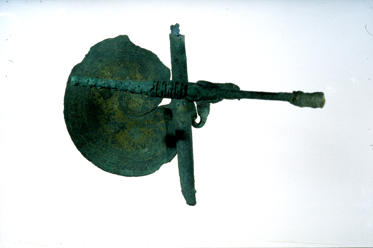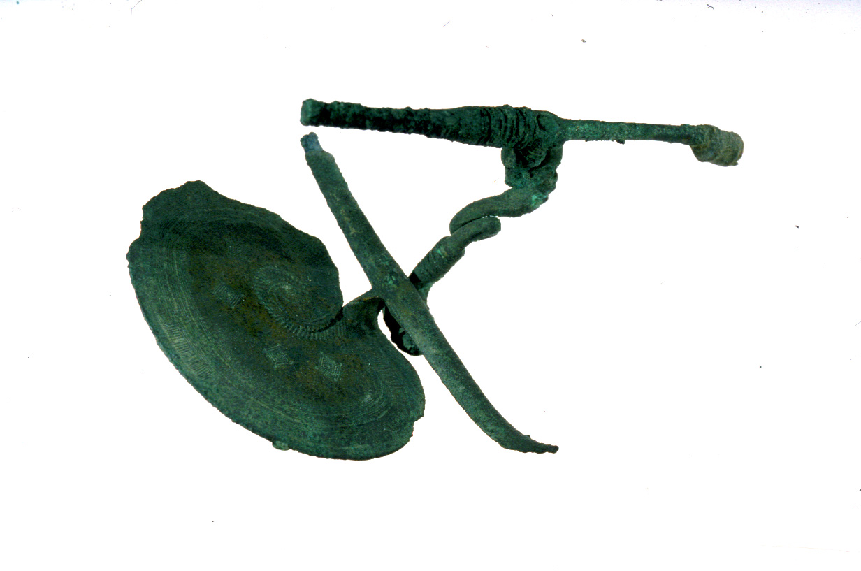 arco serpeggiante a dueocchielli,su cui è inserita l''estremità superiore dello spillone, staffa a disco spiraliforme, con decorazione ad incisione con fasce concentriche, quadratini, spina di pesce