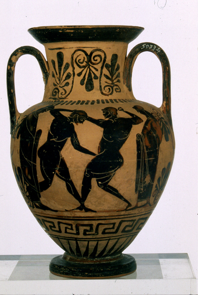 A: ritorno di Efesto all''Olimpo. B: gara di pugilato. In A: al centro, Efesto, in chitonisco e mantelletto, su mulo itifallico, verso destra, tra due satiri danzanti. In B: al centro due pugili affrontati nella lotta, tra due figure ammantate, rivolte verso il centro. Sul collo tre palmette (quella centrale rivolta verso il basso e quelle laterali rivolte verso l''alto), alla base del collo baccellature, al di sotto della scena figurata meandro continuo, alla base raggiera. Sotto alle anse due viticci contrapposti desinenti ciascuno in una palmetta aperta, quello inferiore reca al centro anche un fiore di loto rivolto verso il basso