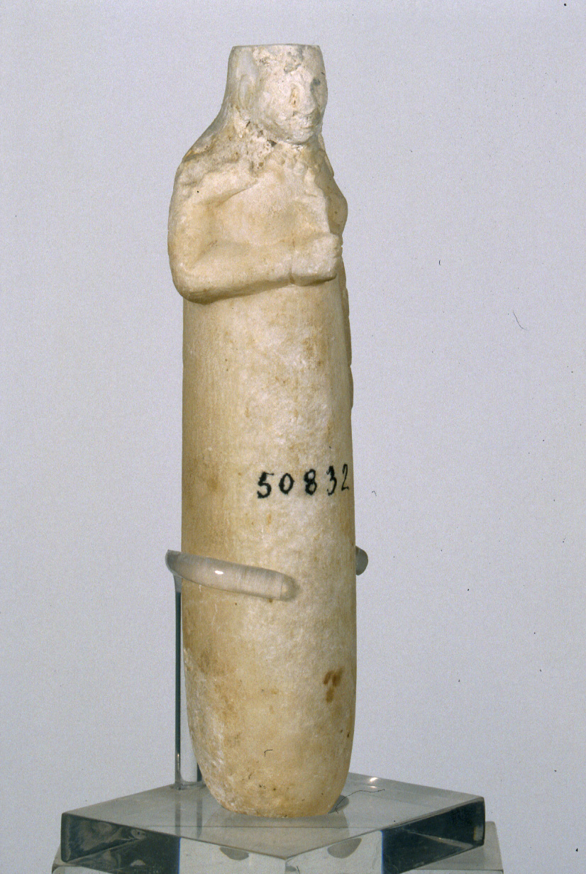 Alabastron configurato a figura femminile: bocchello troncoconico, testa femminile con lungo velo e collana, braccio sinistro teso aderente al fianco, con dita ripiegate ad eccezione del pollice, braccio sinistro piegato ad angolo retto all''altezza del petto con fiore di loto nella mano, parte inferiore cilindrica liscia, fondo arrotondato