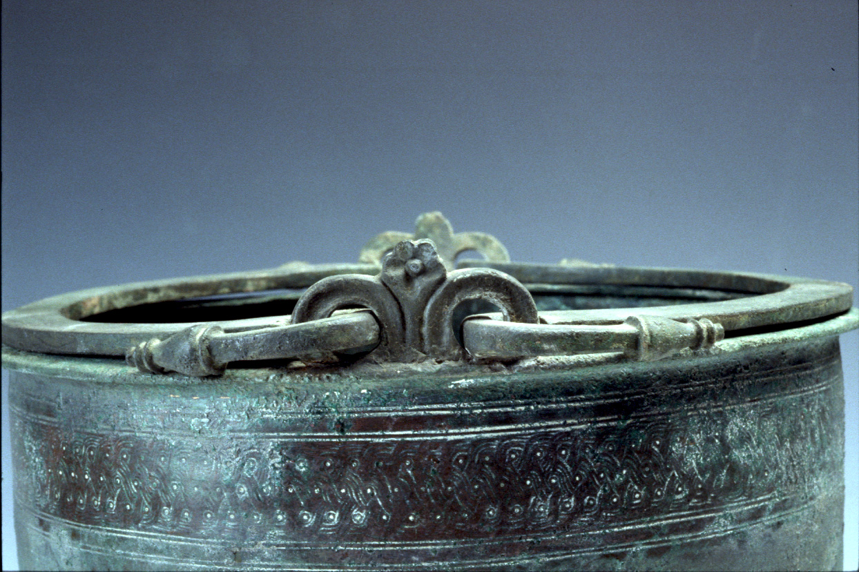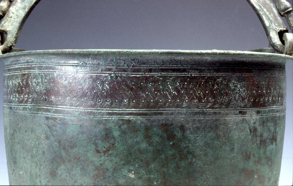 labbro piatto, aggettante verso l''esterno, con breve orlo verticale all''interno, corpo campaniforme a parete rientrante verso il fondo, piede svasato a disco. Sotto l''orlo, fascia decorata costituita da un motivo continuo a doppia guilloche tra due bande lisce, ciascuna compresa tra due fasce di due linee incise. Doppio manichetto ad arco di nastro a sezione rettangolare. Estremità ripiegate con appendici desinenti in un elemento piriforme su listello e coronato da una coppia di dischetti cui è sovrapposto un bottoncino rigonfio. Gli archi sono inseriti in un doppio anello scanalato con protuberanza centrale a forma di rosetta a cinque petali, con pistillo e gambo liscio. Lamina ribattuta e tornita, ripiegata a formate il labbro. Fusi ansa e anelli di inserzione, questi ultimi saldati al labbro. Decorazione incisa al bulino
