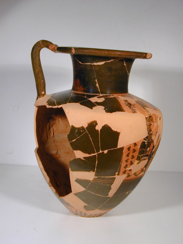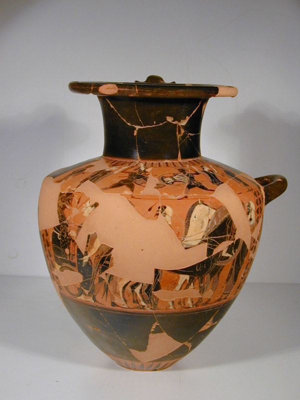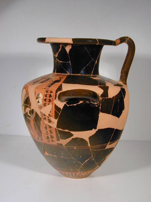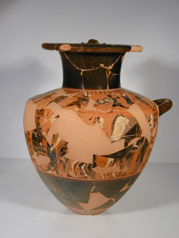 labbro piano arrotondato, collo cilindrico distinto, spalla quasi piana, corpo ovoide rastremato, piede ad echino con orlo modanato; interamente verniciata in nero, tranne una grande metopa tra le anse: sulla spalla, alla base del collo, corte baccellature alternate grigie e nere, scena simmetrica di monomachia tra due figure laterali per parte che assistono; sul corpo scena di partenza con quadriga a destra con auriga, personaggio barbato in conversazione con figura femminile, altri personaggi maschili assistono alla scena. La metopa è incorniciata lateralmente da doppia fila di foglie d''edera; linee suddipinte in paonazzo alla base della metopa e presso il piede con una zona risparmiata con raggi bruni. Argilla 5YR 7/6 (reddish yellow), vernice nera omogenea, dettagli incisi con suddipinture in bianco e paonazzo