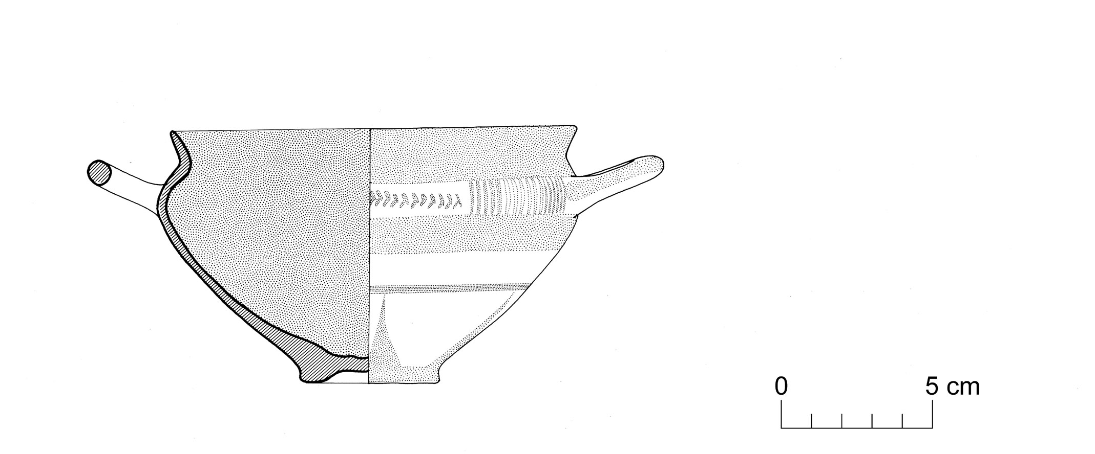 corpo troncoconico , leggermente bombato orletto verticale ha le anse con gruppi di sigma tra linee verticali. fasce e triangoli intorno al piede