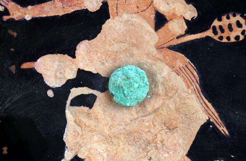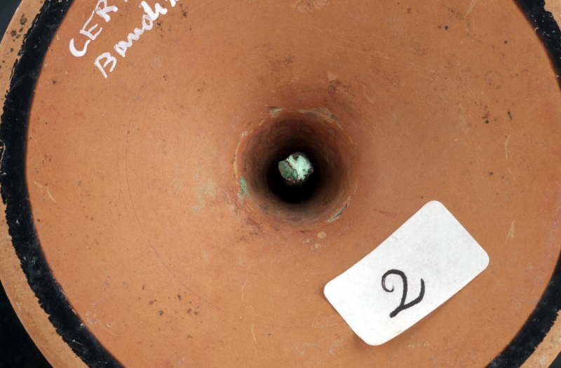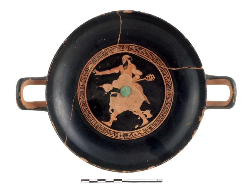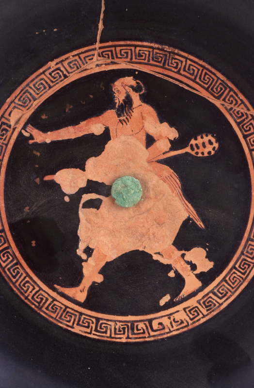 Nel tondo interno, entro cornice a meandri, satiro gradiente verso sinistra con tirso nella sinistra e braccio destro teso; di fronte al satiro, iscrizione dipinta "ho pais kalos"; superficie esterna interamente verniciata; al centro della vasca, restauro antico consistente in chiodo di bronzo che unisce la vasca al piede. argilla depurata 2.5 YR 7/6 (light red)