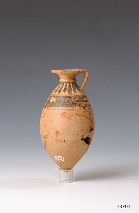 Alabastron etrusco-corinzio in argilla acroma, piccolo collo modanato e labbro estroflesso, corpo globulare fortemente piriforme, fondo a punta. L''ansa a nastro è impostata dal labbro alla spalla. La decorazione è a petali neri sul labbro e sulla spalla e a linee parallele orizzontali di colore nero e brunastro sotto l''attacco inferiore dell''ansa