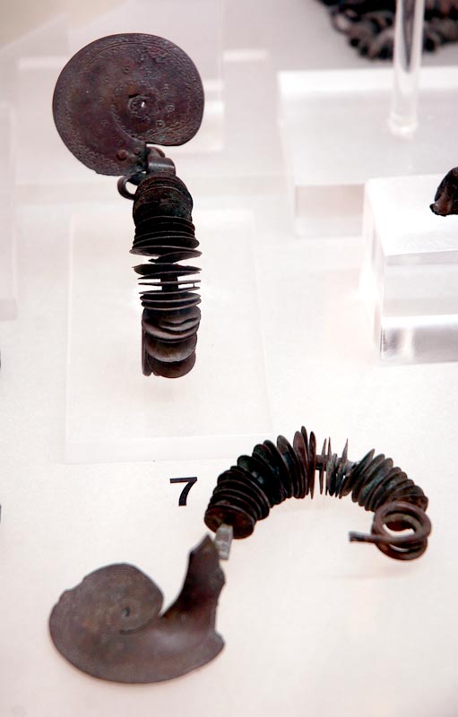 Staffa a disco spiraliforme pertinente a fibula, di bronzo. Contorno circolare, dimensioni contenute, con spirale ampia e centrale, lamina piuttosto spessa. Decorazione, impressa a punzone e incisa a bulino, costituita da una stretta fascia marginale con motivi a zigzag impressi alternati a motivi lineari incisi, mentre nel campo è una fila di nove rosette a punzone. Resta uno dei due fori per il fissaggio all''arco mediante ribattini