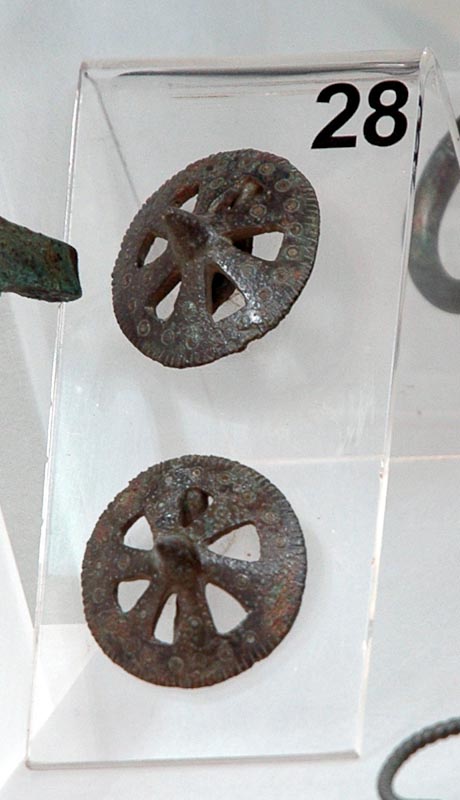 Falera in bronzo a ruota raggiata. Decorazione a cerchielli e linee incise