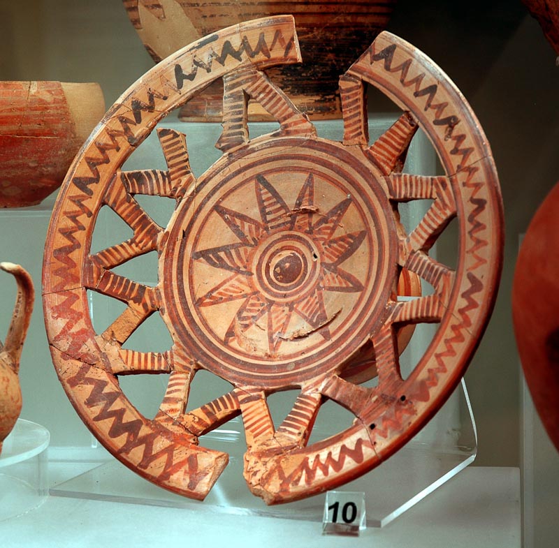 Piatto etrusco-geometrico su alto piede. Sia la vasca tronco-conica, sia il piede sono decorati da triangoli a giorno. Decorazione dipinta in rosso. Pittore Argivo