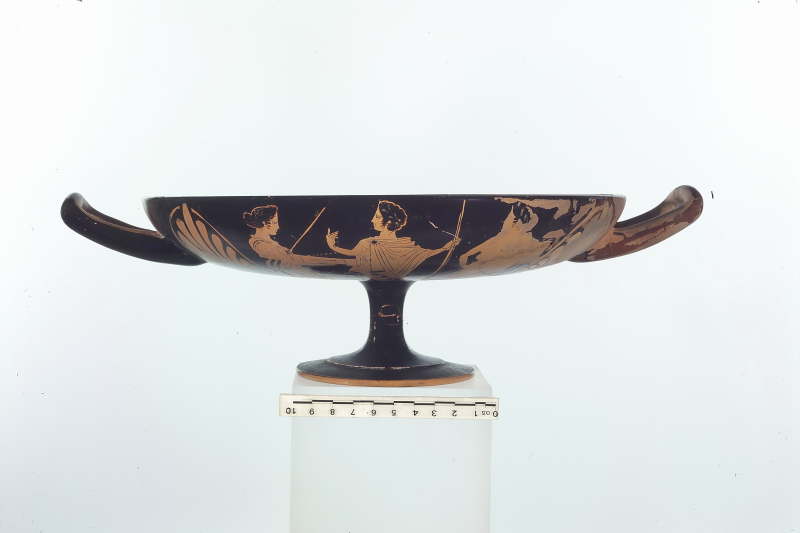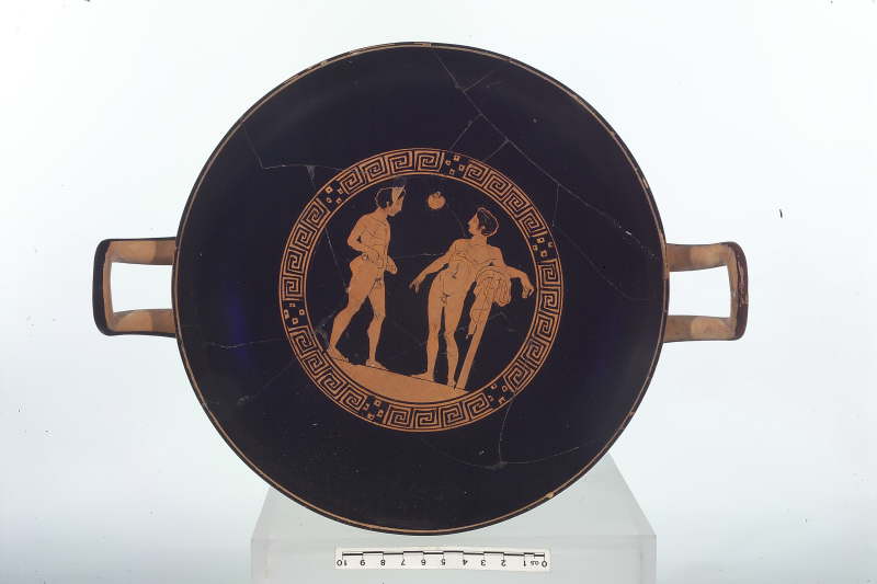 Kylix attica a figure rosse con coppia di atleti. Pittore di Londra E106. La tomba nel complesso è databile al 400-350 circa a.C