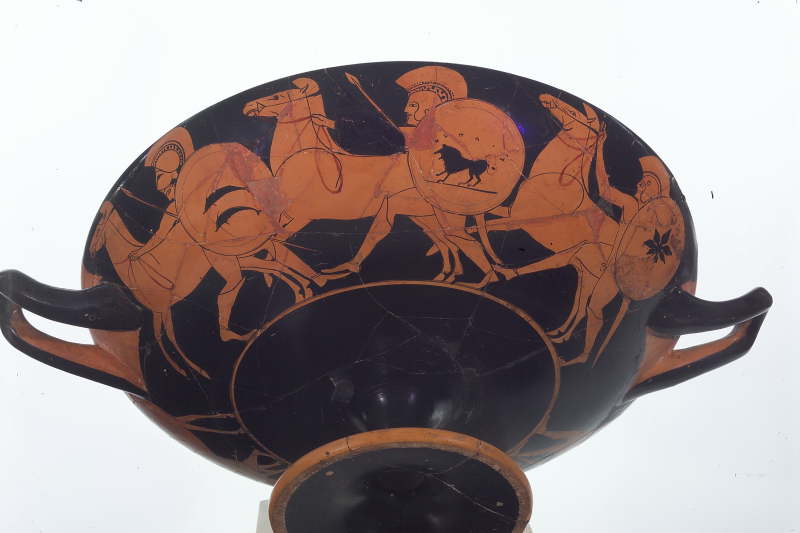 kylix a figure rosse con giovane che versa da una brocca (interno), e guerrieri con i loro cavalli, uno dei quali con armatura scita (esterno). Pittore di Berlino 2268