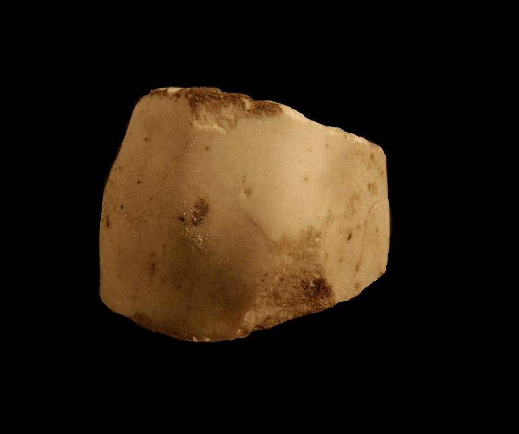 scultura e plastica, statuaria e rilievi, statua . Ginocchio di statua con rotula e condilo anatomicamente poco pronunciati. Superficie liscia interessata da leggere scheggiature e incrostazioni