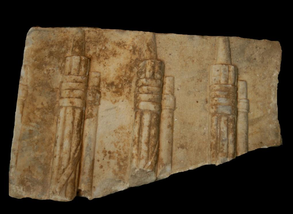 scultura e plastica, statuaria e rilievi, rilievo funerario . Frammento marginale inferiore di lastra rettangolare priva di cornice, fratta superiormente e ai lati, con la rappresentazione di quattro fasces a rilievo. Resta la parte terminale di tre fasci di verghe e di quattro manici di scuri (uno è parzialmente visibile lungo il margine fratto destro), mentre il resto del supporto è frutto di un’integrazione moderna in gesso. Sembra assai verosimile che il manufatto appartenga all’arredo parietale esterno del sepolcro di un personaggio di rango, come suggerisce il confronto tipologico con l’edificio sepolcrale rinvenuto a Labicum di P. Cluvius Maximus Paullinus, console all’inizio del regno di Antonino Pio, che esibisce in fronte lo status socio-politico del senatore attraverso la rappresentazione di dodici fasci littorii, distribuiti simmetricamente ai due lati del titulus maior con il cursus honorum completo [AE 1940, 99 = 1946, 168, cfr. anche Eck 1996, tav. X, fig. 1], o con la lastra sepolcrale di arredo parietale esterno del pretore L. Sinicius Reginus (II/III sec. d.C.), oggi murata nel chiostro di S. Paolo fuori le mura [Filippi 1998, fig. 90], che mostra - come simboli onorifici dell’ultima carica ricoperta dal defunto - una sella curulis con piedi a zampa leonina e quattro fasces, tre a destra e uno a sinistra del titulus maior, che in origine dovevano essere tre per parte [CIL, VI 1521, cfr. p. 3142, cfr. anche Eck 1996, tav. XI, fig. 2]. Altri esempi analoghi sono ad es. il rilievo scolpito con sei fasces conservato sempre nel chiostro di S. Paolo [Filippi 1998, fig. 90] e la fronte del sepolcro di C. Cartilius Poplicola a Ostia con la rappresentazione di sedici fasci littorii, due per ciascuna delle otto volte che il magistrato aveva ottenuto il duovirato ricordato nel titulus maior [AE 1968, 82].Per quanto riguarda lo status sociale del committente del rilievo in esame, la presenza di quattro fasces e il confronto tipologico con i monumenti sopra ricordati, permette di ipotizzare che si tratti di un personaggio di rango consolare. I fasces scolpiti sul nostro supporto dovevano pertanto essere originariamente sei, ai quali facevano pendant altri sei fasci rappresentati su una lastra di rivestimento parietale accostata, forse posta a sinistra di un titulus maior perduto, come nel monumento di P. Cluvius Maximus Paullinus a Labicum. Superficie liscia interessata da scheggiature e incrostazioni