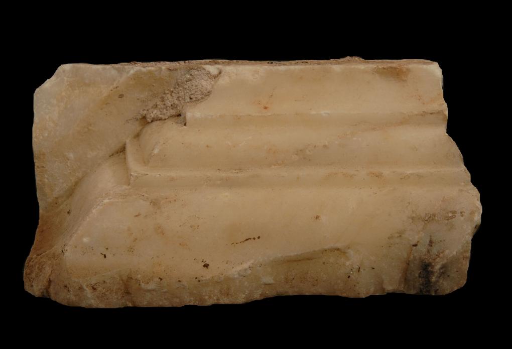 elementi architettonici e di rivestimento, rivestimenti parietali e pavimentali, incorniciatura modanata . Il frammento ha il fianco destro fratturato. Il retro è sbozzato. La superficie superiore è liscia; in essa si apre il foro per il perno di fissaggio. La suprerficie anteriore, a vista, ha una modanatura liscia costituita da: (dall'alto) gola dritta, ovulo e cavetto