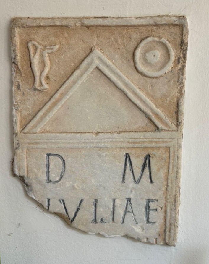 frammento di stele con frontone a rilievo triangolare tra un urceus e una patera, iscrizione parzialmente leggibile