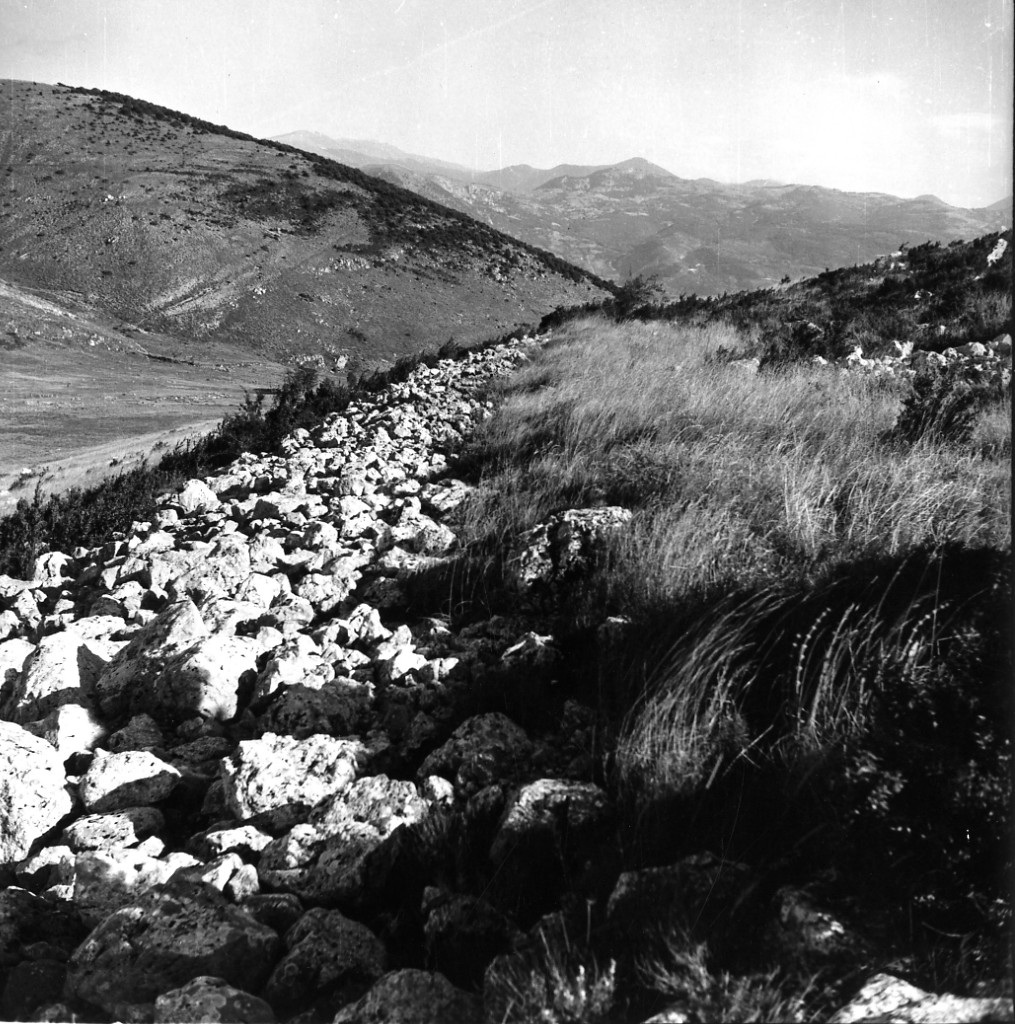 • NOTIZIE STORICO CRITICHE Gli oppida Marsi, posti su monti e colline, in chiara posizione dominante e di controllo di accessi a pascoli interni o grandi vie di comunicazione, i recinti o centri fortificati Marsi, costituiscono uno degli elementi caratterizzanti del paesaggio e sono una delle più grandi realizzazioni architettoniche lasciateci da questo popolo. La loro posizione in quota, rispetto al livello del mare, va da un minimo di 670 m ad un massimo si 1666. Sono generalmente a pianta ovoidale o ameboidale, con qualche variante, e presentano una o due recinzioni di muratura posta a secco. La pianta, comunque, è il più delle volte determinata dall’orografia e morfologia dei luoghi. La muratura, composta di pietrame di tipo calcareo, è posta in opera a secco, con una cortina composta da filari di blocchi, grandi e piccoli, e con l’uso di molte zeppe nei vuoti lasciati dal contatto dei vari blocchi, ed è vagamente collegabile alla prima e alla seconda maniera poligonale (Lugli, 1957), dato lo stato appena sbozzato ed informe dei blocchi utilizzati. La muratura poggia direttamente sulla roccia di base, senza trincee di fondazione. Lo spessore della muratura varia dai 1.80 ai 3 m ed è costituito: da un paramento esterno, formato da grossi blocchi ben disposti; da un paramento interno, formato da medi e assai informi blocchi; da un riempimento di pietrame medio e minuto, posto all’interno fra i due paramenti. Nei casi di muratura posta su un forte pendio roccioso, il muro costituisce un bastione con terrapieno interno, il tutto costituito da: un paramento esterno, leggermente aggettante verso l’interno e composto da grossi e spessi blocchi; da un terrapieno alle spalle, costituito da un riempimento di pietrame medio e minuto unito a terra. È, inoltre, possibile in alcuni oppida, l’uso, alle spalle del muro di cinta, di un terrapieno a piano inclinato o “aggere”, contenuto da uno o più muri di controscarpa ed utilizzato solo nei casi di posizionamento del muro su un dosso (tale sistema appare nell’oppidum della Giostra, località Amplero in comune di Collelongo, L’Aquila). Nell’interno, alle spalle della recinzione, è presente in tutti i recinti attualmente conosciuti, una fascia anulare o strada di percorrimento interno in pietrame, di un’altezza costante di 5 m, che è formata da un terrapieno composto da un riempimento di pietrame e terra appositamente spianato e pressato, sì da costituire un sub aggere. La funzione di queste fasce anulari era quella di permettere un rapido e facile percorso della cinta da parte dei militi della difesa. Va, inoltre, notato che, in alcuni casi, la difesa degli oppida veniva affidata, nei casi di dolce pendio, non solo alle mura, ma anche ad appositi fossati, scavati e posti all’esterno del muro di cinta. Lungo le mura dei recinti più piccoli, quasi sempre, si aprono due porte di cui: una piccola o posterula di ampiezza variabile da 1 a 1.45 m; una grande, con ingresso realizzato da uno sdoppiamento parallelo del muro di cinta, di ampiezza variabile da 1.50 ai 2.50 m. Nei centri grandi o medi la presenza e il numero delle porte varia da 3 a 4, pur mantenendo le stesse dimensioni di ingresso. Negli oppida medi e grandi sono presenti, nell’interno, muri di terrazzamenti, relativi ad adattamenti per la creazione di terrazzi adatti al posizionamento in piano di capanne. Quasi sempre presente, nell’interno degli oppida, è una o più cisterne, scavate nella roccia e foderate di muratura. La cisterna più comune presente nei centri fortificati marsi è del tipo circolare con banchina anulare in muratura posta a contatto col fondo (presente nei centri fortificati di M. Alto di Trasacco e di La Giostra di Collelongo, cfr. Letta 1977); l’originalità delle cisterne marse sta nella presenza, sempre costante, di due colonne poste sulla vera della cisterna, atte a reggere il verricello preposto per l’attingimento dell’acqua dal fondo della cisterna. In complesso si possono distinguere 5 tipi di oppida che sono: I - con pianta ovoidale o rotonda, con una sola recinzione, 2 porte e cisterna circolare sulla sommità; questo tipo è molto vicino come tipologia ai centri fortificati umbri ed è generalmente di piccole dimensioni che non superano i 500 m di circonferenza; II - con pianta ovoidale o ameboidale, con 2 recinzioni, almeno 3 porte, cisterna sulla sommità, terrazzamenti e con circonferenza muraria variabile dai 400 ai 1000 m; … [cfr. OSS]