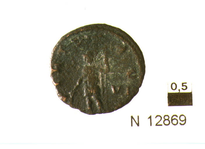 R/ testa di imperatore con corona radiata a destra; V/ Virtus elmata con abiti militari con scudo e lancia, stante a sinistra,