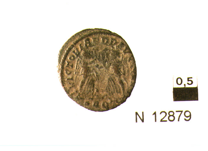 R/ busto drappeggiato corazzato e diademato di imperatore a destra; V/ due vittorie volte l'una verso l'altra sorreggono uno scudo,