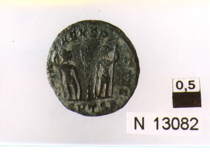 R/ busto drappeggiato, corazzato e diademato di Costantino a destra; V/ due soldati stanti tra uno stendardo, rivolti l'uno verso l'altro con scudoe lancia,