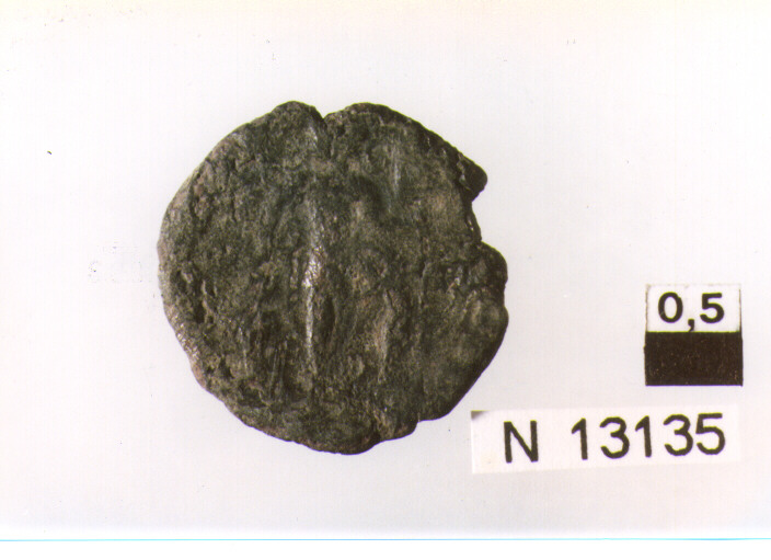 R/ busto drappeggiato corazzato e diademato di imperatore non identificato a destra; V/ imperatore in abiti militari avanza verso destra con labaro, trascinando un nemico,