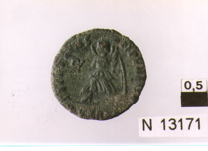 R/ busto drappeggiato, corazzato e diademato di imperatore non identificato a destra; V/ vittoria a sinistra con corona,