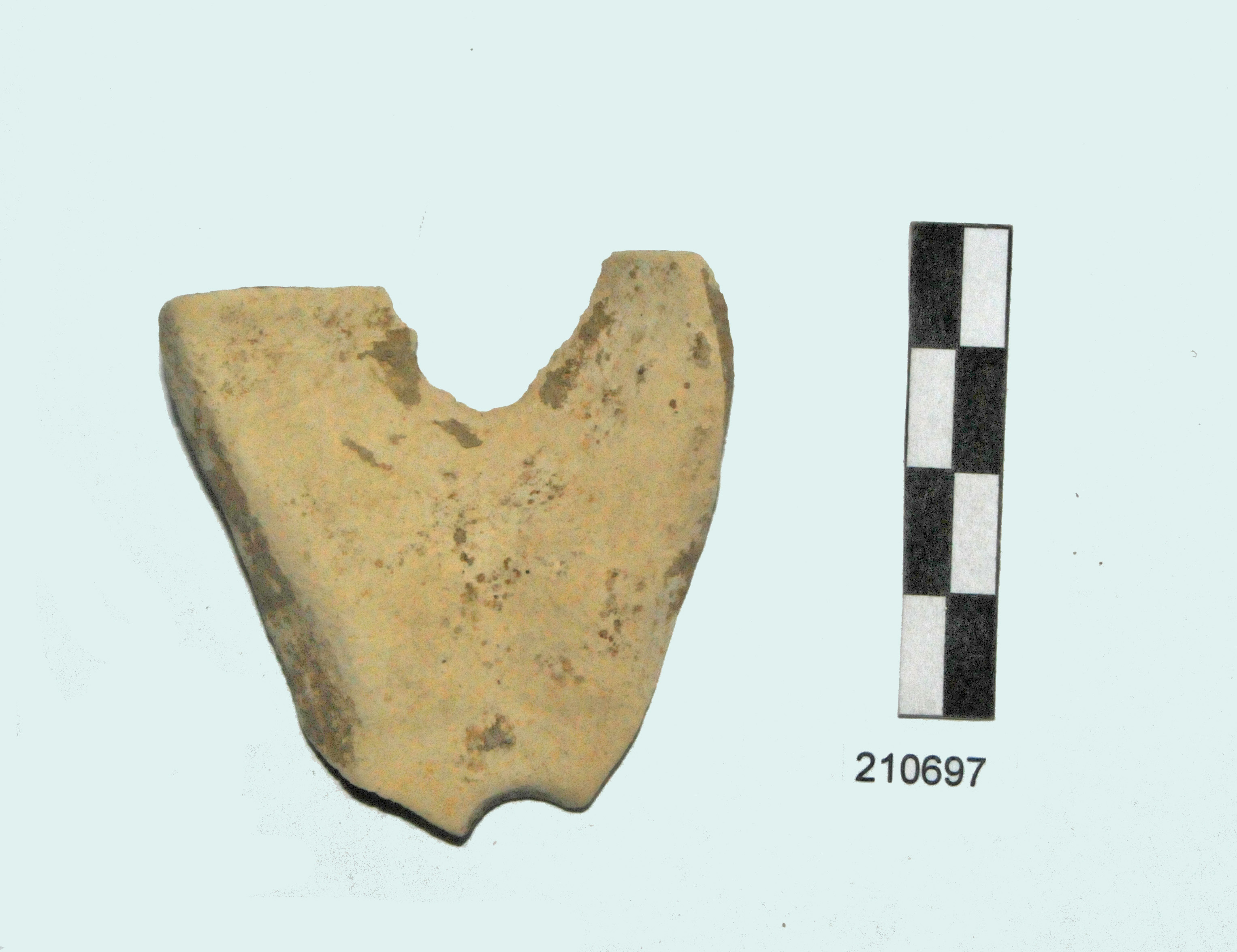 L'esemplare è incompleto. E' presente solo parte del disco leggermente concavo con traccia delle linee ogivali incise e convergenti verso il centro, ai lati del quale appare il motivo decorativo delle due teste d'uccello contrapposte, non completamente leggibili