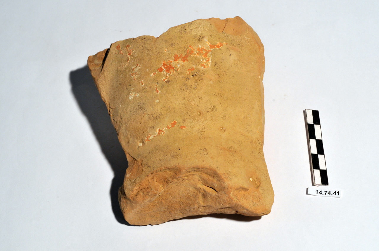 Frammento anatomico (tracce di colore rosso su preparazione bianca in latte di calce), probabilmente pertinente al torso nudo di una statua di divinità maschile che decorava lo spazio triangolare del frontone. E' probabile, infatti, che nel cavo frontonale fosse rappresentata un'assemblea di divinità, schierate paratatticamente. La notevole frammentarietà dei reperti, non consente di individuare una scena precisa o un particolare episodio mitologico