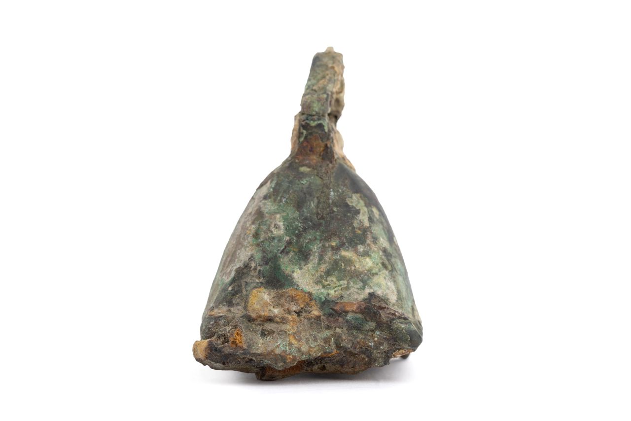 Campanello in bronzo di forma tronco-piramidale con anello apicale dalla forma pentagonale per la prensione a mano o la sua sospensione. La partesottostante l’anello è a forma di calotta a sezione quadrangolare, il corpo è tronco piramidale, con base quadrangolare munita di piedini angolari a globetto schiacciato